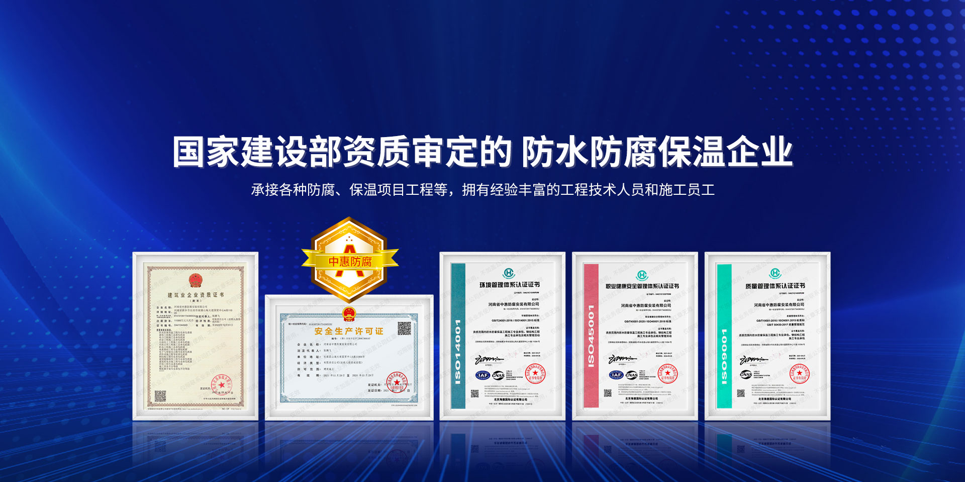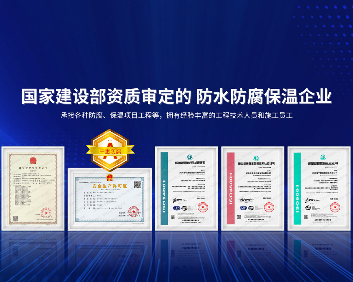公司經營范圍:防水防腐保溫工程;消防設施工程;建筑裝修裝飾工程;建筑機電安裝工程;電力工程;建筑工程;石油化工工程;工業清洗工程;油罐清洗工程;鋼結構工程;環保工程;模板腳手架工程;電纜防火封堵、防污閃噴涂、外墻外保溫工程;各類施工勞務作業;設備維修、船舶鉚焊、涂裝;電力工程材料、建材、防水材料、防火材料、防腐保溫材料銷售,并相繼通過了GB/T19001-2008idtISO9001:2008GB/T50430-2007質量管理體系認證證書。GB/T24001-2004idtISO14001:2004環境管理體系認證證書。GB/T28001-2011idtOHSAS18001:2007職業健康安全管理體系認證證書。公司是中國防腐蝕于防護協會、中國施工企業管理協會、電力協會和中國鋼結構防水協會會員單位。 公司的經營業務涵蓋了石油、化工、電力、冶金、煤炭、船舶、國防、燃氣、水利、環保、交通運輸、航空及國防軍工和輕紡市政等行業的防腐保溫絕熱設備。鋼結構安裝、防火、防水、金屬噴鍍、聚脲噴繪、陰極保護、防滲透堵漏、玻璃鋼及各種磚版材料襯里、橡膠襯里、煙氣硫和耐酸溶劑腐蝕等工程施工。公司連續十年榮獲“省市先進施工企業”“安全生產先進單位”“重合同,守信用企業”和“AA***資質企業”的稱號。2000年被命名為市級文明單位,2002年被國家工商行政管理局命名為“重合同,守信用的企業”、被中國工業防腐蝕技術協會命名為“防腐蝕企業,能源節約及環境保護領域有豐富的經驗和***的業績。工程一次交驗合格率100%。其中攀枝花鋼鐵公司煉鐵廠四號高爐及熱風爐防腐工程、上海寶鋼公司煤氣柜防腐工程、撫順石油一廠裝置防腐項目、齊魯石化公司稀烴廠高塔防腐工程、吉林化學工業公司煉油廠油罐防腐工程、天津石化熱電廠六號爐頂棚聯絡管保溫工程、大慶油田(太倉)力神泵業工程、中國化學工程第十一建設工程、中原油田勘探局工程、中國石化銷售有限公司華北分部、魯皖輸油管道工程、貴州開磷息烽合成氨工程、陜西黃陵煤化工程、中國石油天然氣西部管道塔里木輸油工程、邯鋼集團邯寶鋼鐵公司煉鐵工程、德州供電工程、吉寶(南通)船廠工程,偃師華潤熱力工程、鄭州熱力總公司。 河南省中惠防腐安裝有限公司愿以豐富的施工經驗,***的技術,***的設備,***的管理,***的服務,竭誠為國內外廣大的用戶提供***滿意、******的工程作品。 我公司愿與國內外同仁一道,團結協作,共同推進防腐蝕行業發展! 公司地址:河南省長垣縣建設路北段360號 固定電話:0373-8866488 郵編:453400 網址:http://www_zhff_com_cn.zhengzhishanliang.com
